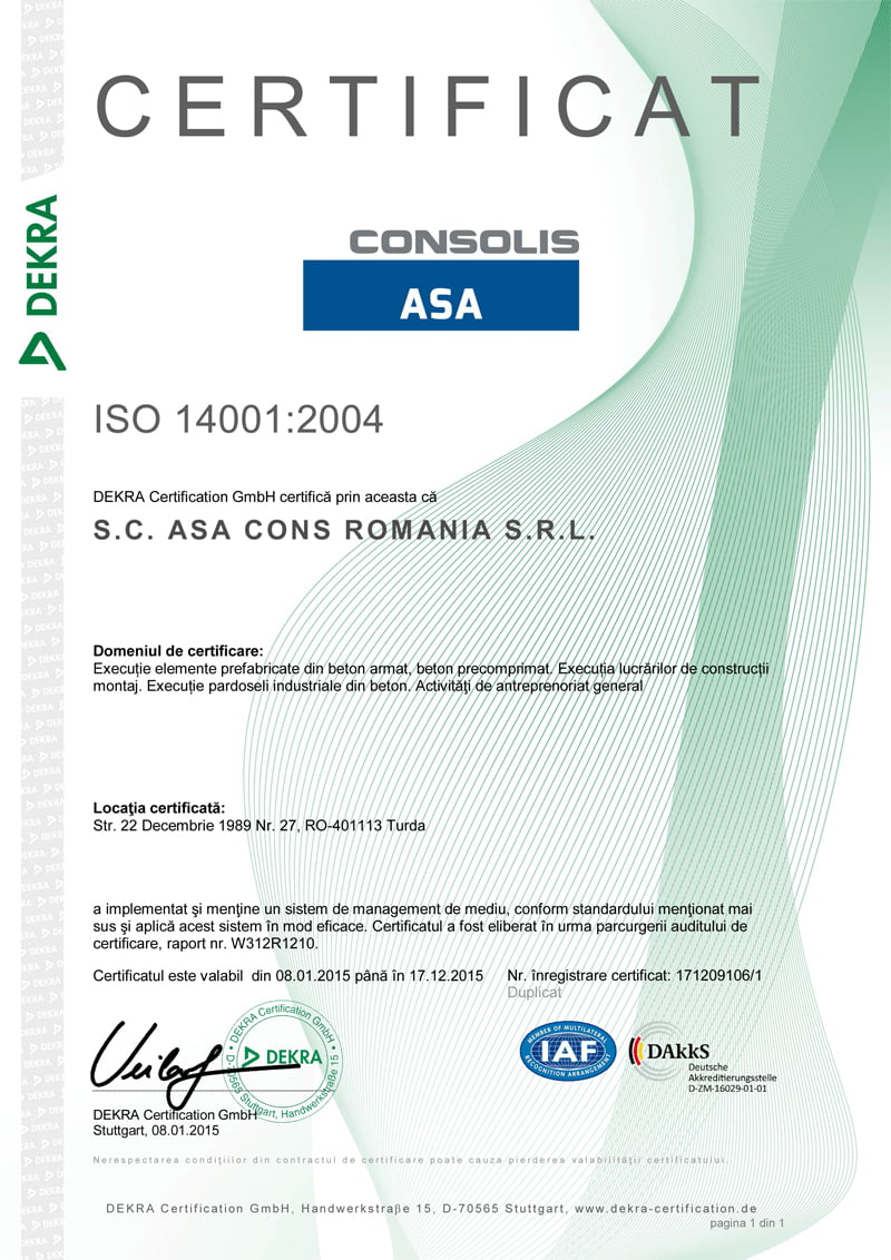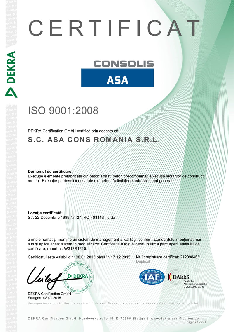 Managementul ASA CONS acordă o atenţie deosebită calităţii produselor şi serviciilor oferite, urmărind zilnic depăşirea standardelor asumate prin certificarea sistemelor de management al calităţii ISO 9001:2008, de mediu ISO 14001: 2004 şi al sănătăţii şi securităţii în muncă OHSAS 18001:2007.