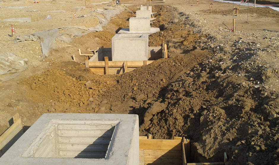From the structure of the pocket foundation the collar is precast executed; on site it is vertically rotated by 180 degrees, then the plate reinforcement is connected on stubs and assembled in position. By eliminating labor on site and concrete maturation time, the erection speed of the structure rises considerably.